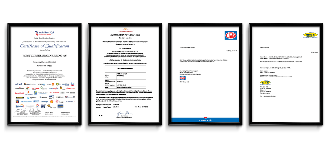 Vi er prækvalificeret som leverandør i henhold til Achilles Joint Qualification System (JQS), autoriseret af Søfartsstyrelsen til hejsemidler og lossegrej og autoriseret service partner for HMF og Heila marinekraner.